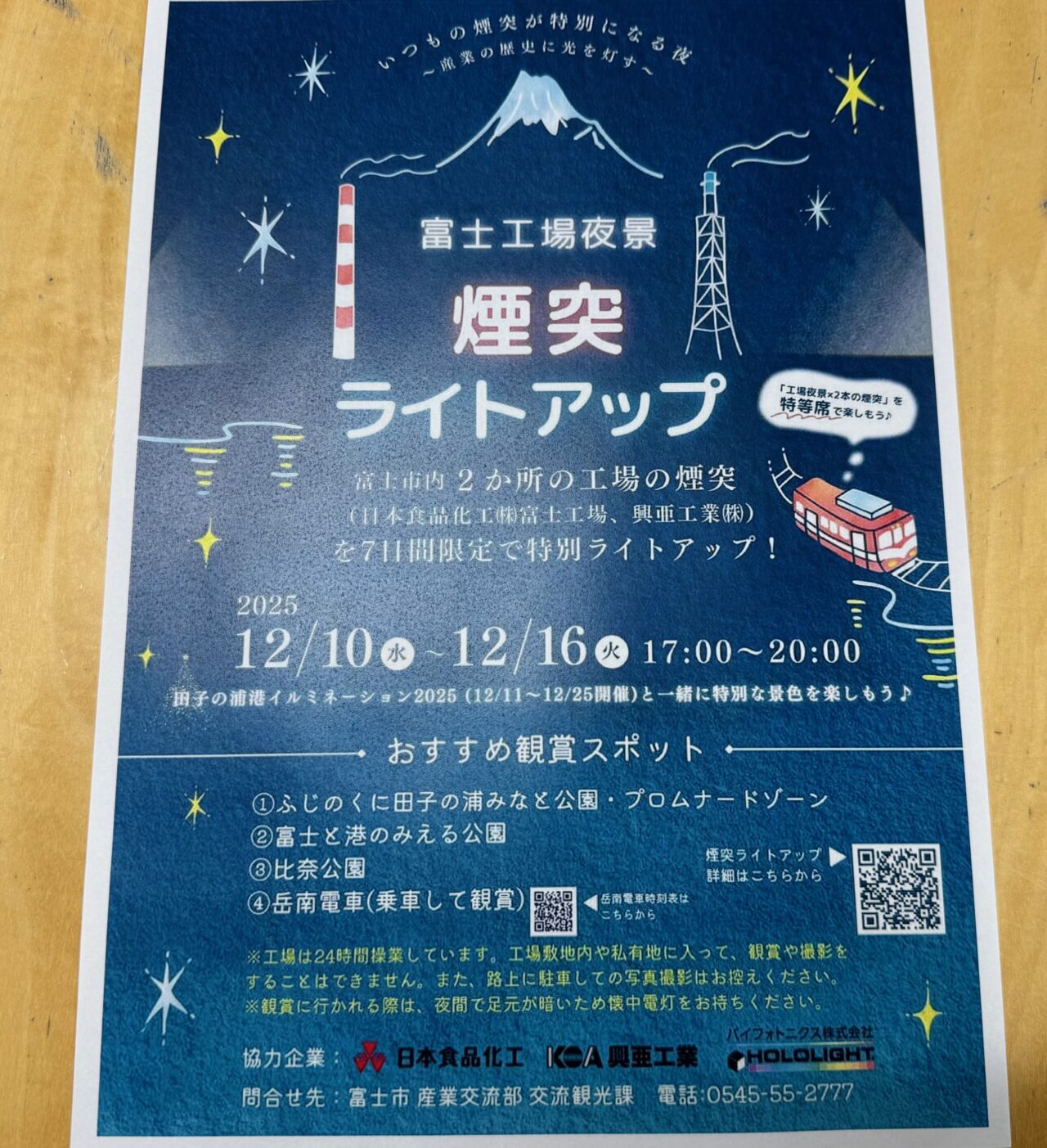 2025年12月10日~16日には富士市ならではの工場夜景を多くの人に楽しんでもらうため、市内2か所の工場(日本食品化工株式会社富士工場、興亜工業株式会社)の100メートル級の煙突2本が期間限定でライトアップされました。