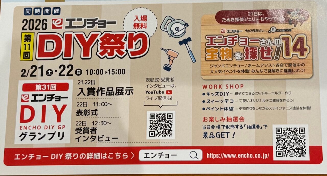 第31回エンチョーDIYグランプリの入賞作品展示やワークショップ、お楽しみ抽選会など開催!わんわん大サーカスやチアダンスのステージもあります!親子で楽しめますよ!