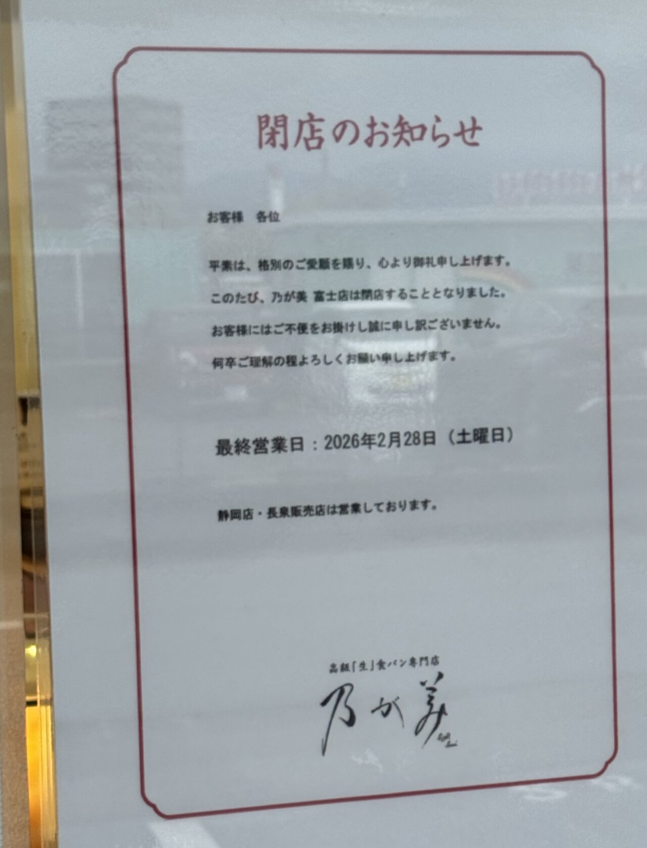 そんな究極の食パンを販売している「乃が美 富士店」が2026年2月28日をもって閉店してしまいます。