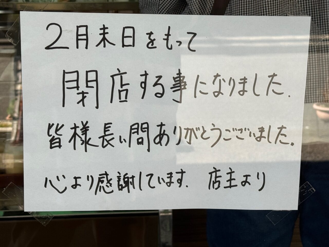 吉原商店街の公式X(旧twitter)から閉店のお知らせがありました。店先には閉店のお知らせが掲示されています。