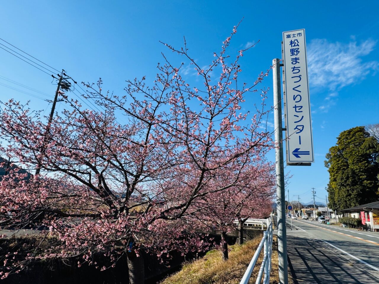 「FUJIYAMAダイニングえびす」のある交差点付近からマミー松野店のある交差点付近まで約500mの沿道に河津桜が咲いています。