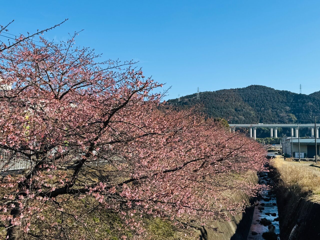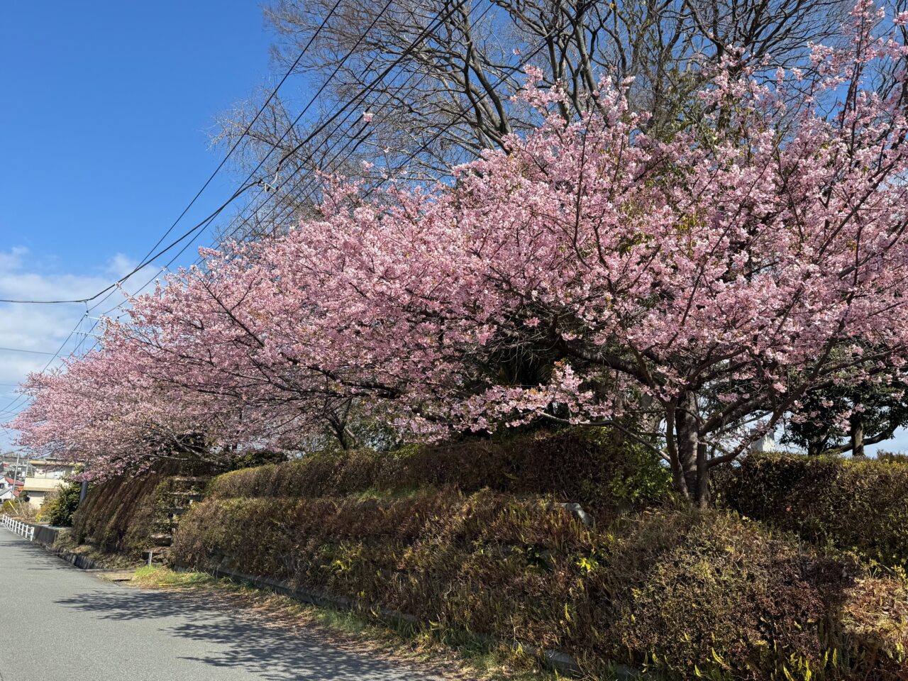 テニスコートの周辺や東名高速道路沿いの河津桜も見頃を迎えています。