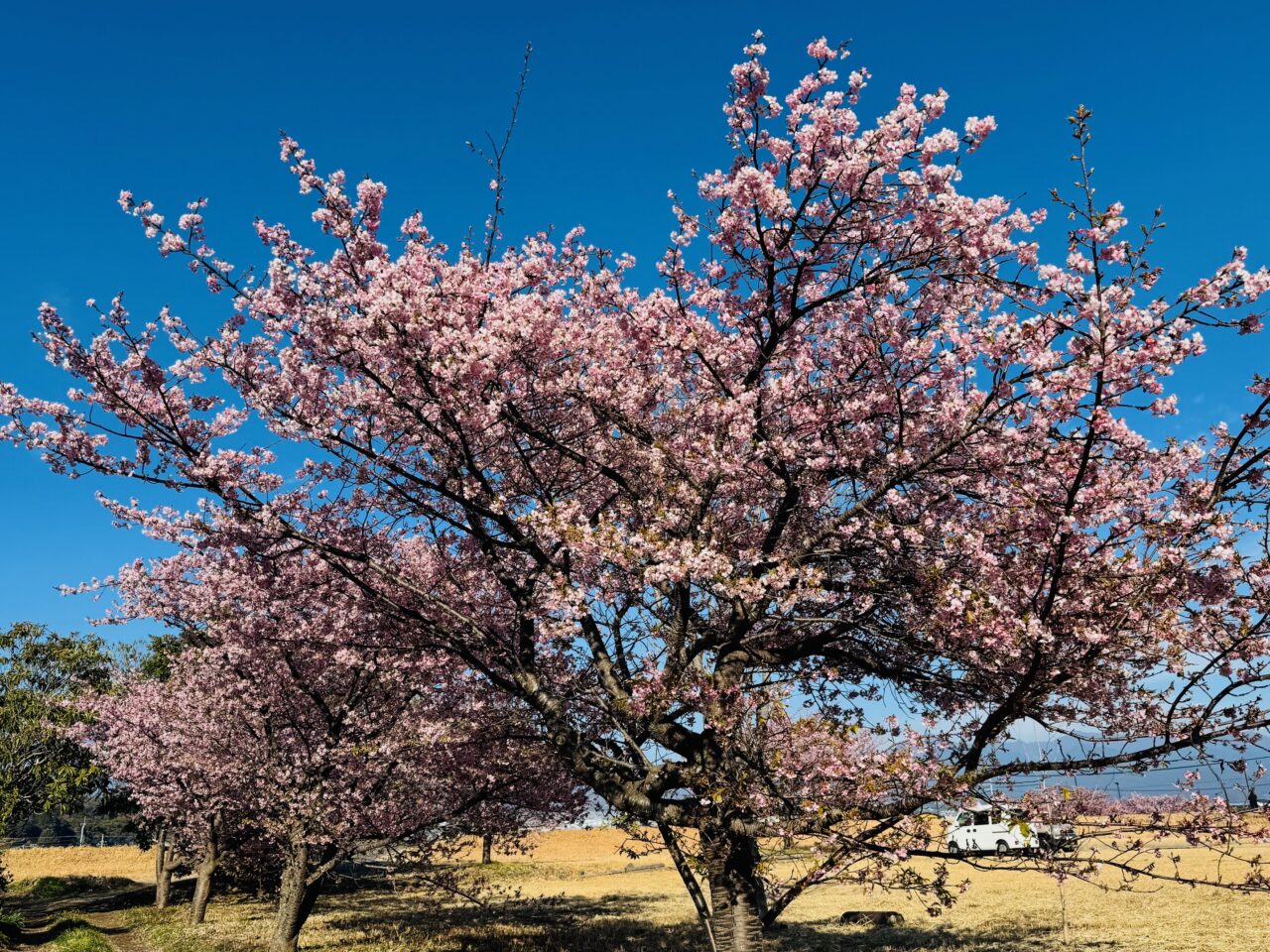 富士川かりがね橋の東側、実相寺交差点を通過する時にピンクの桜が目に飛び込んできます。こちらには河津桜が咲き誇っています。