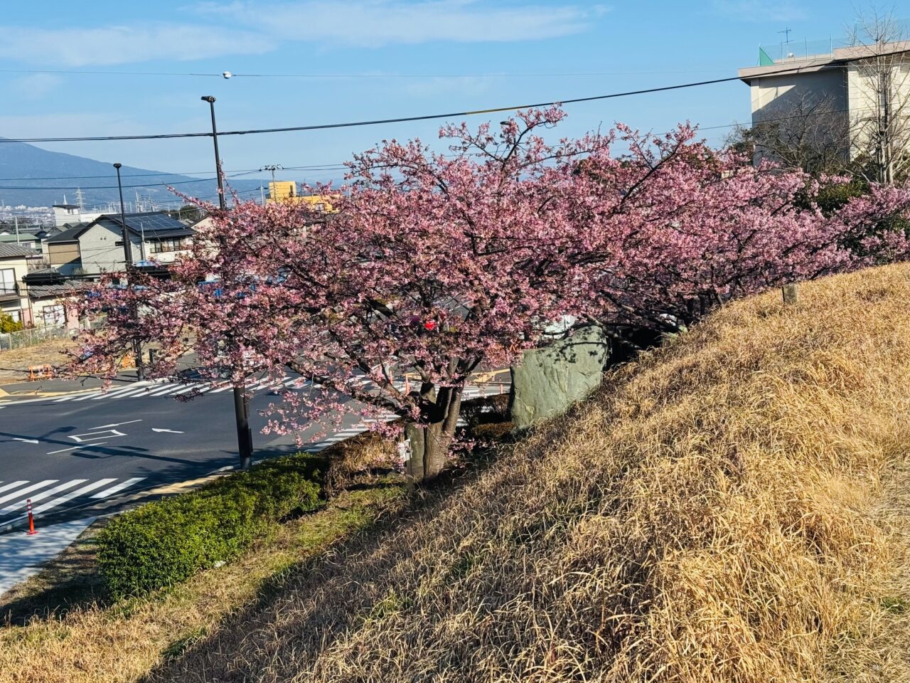 テニスコートの周辺や東名高速道路沿いの河津桜も見頃を迎えています。