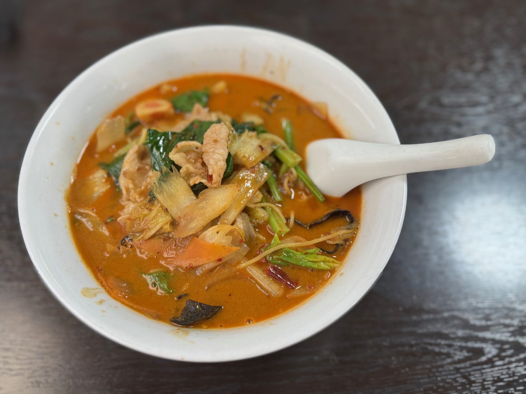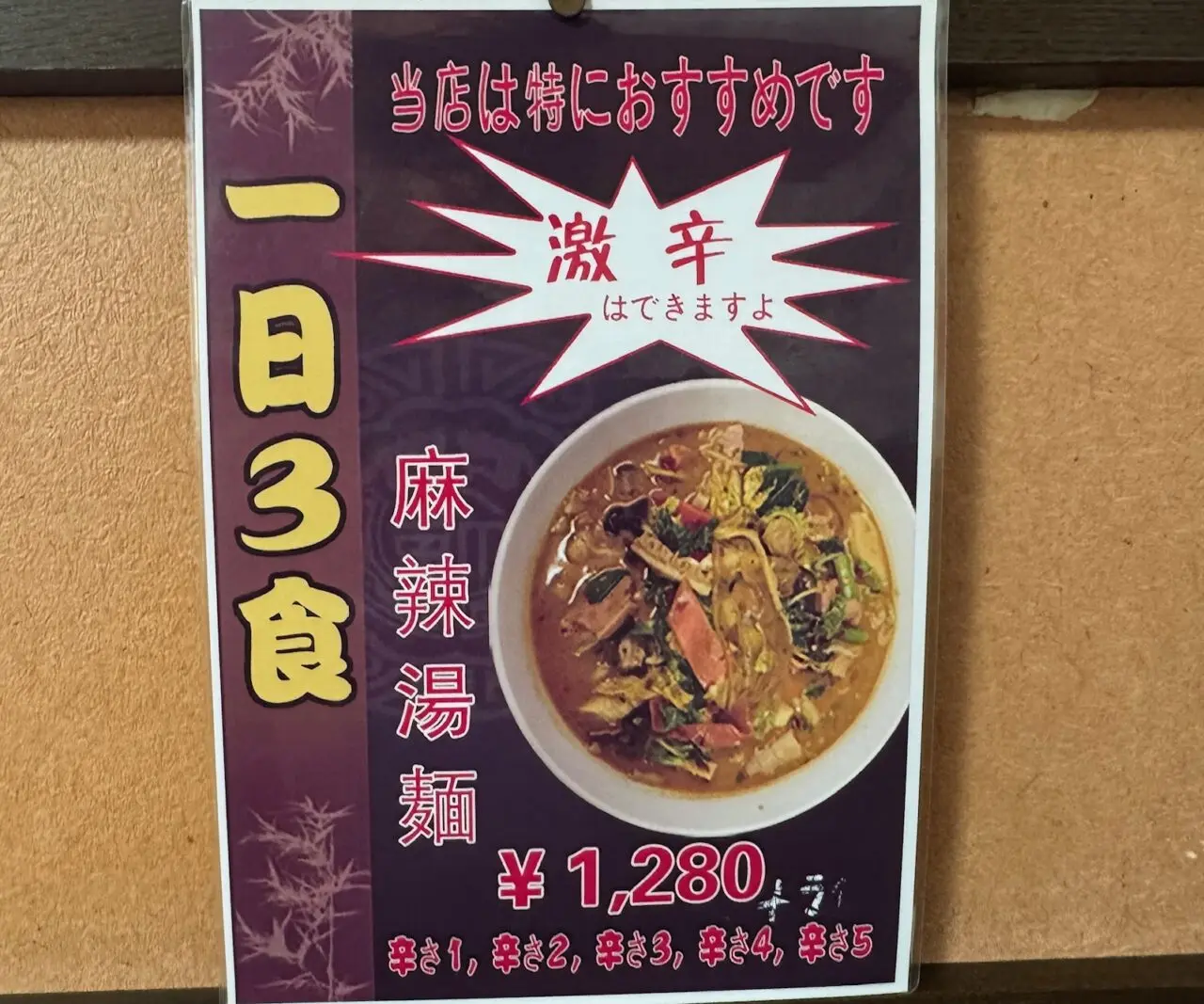 辛いものが好きな同行者は特におすすめの「麻辣湯麺」1,280円を選びました。辛さが1~5まで選べます。辛さ5の激辛を注文しました。