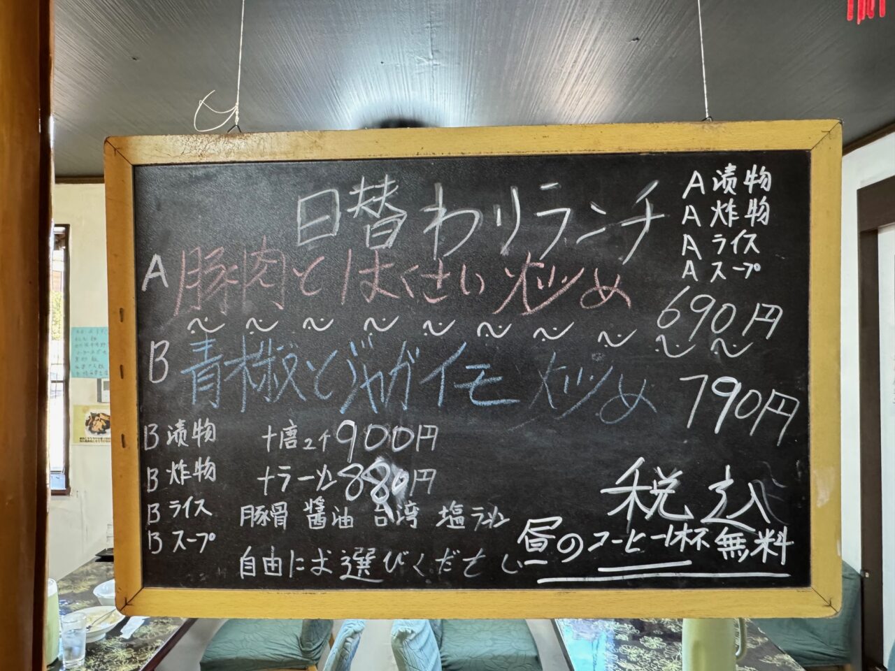 「日替わりランチ」この日は「A豚肉とはくさい炒め690円(税込)」・「B青椒とジャガイモ炒め790円(税込) 炒めもの、ライス、スープ、漬け物付き。ランチタイムはコーヒーが1杯無料です。メニューが多く記事に掲載していないものもあります。来店時にお確かめください。