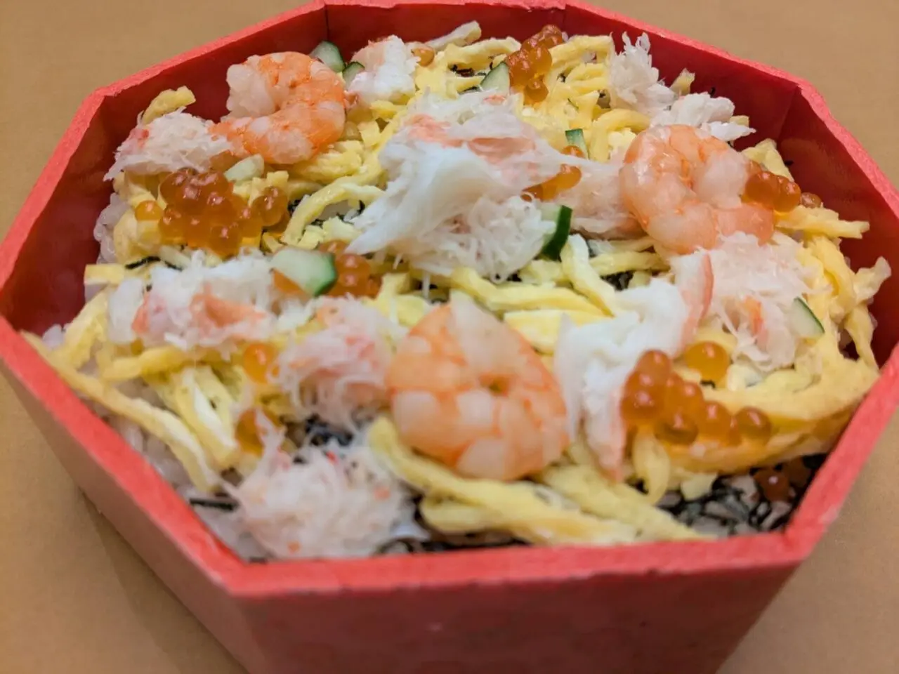 かにと海老が入った春らしい彩りのちらし寿司です