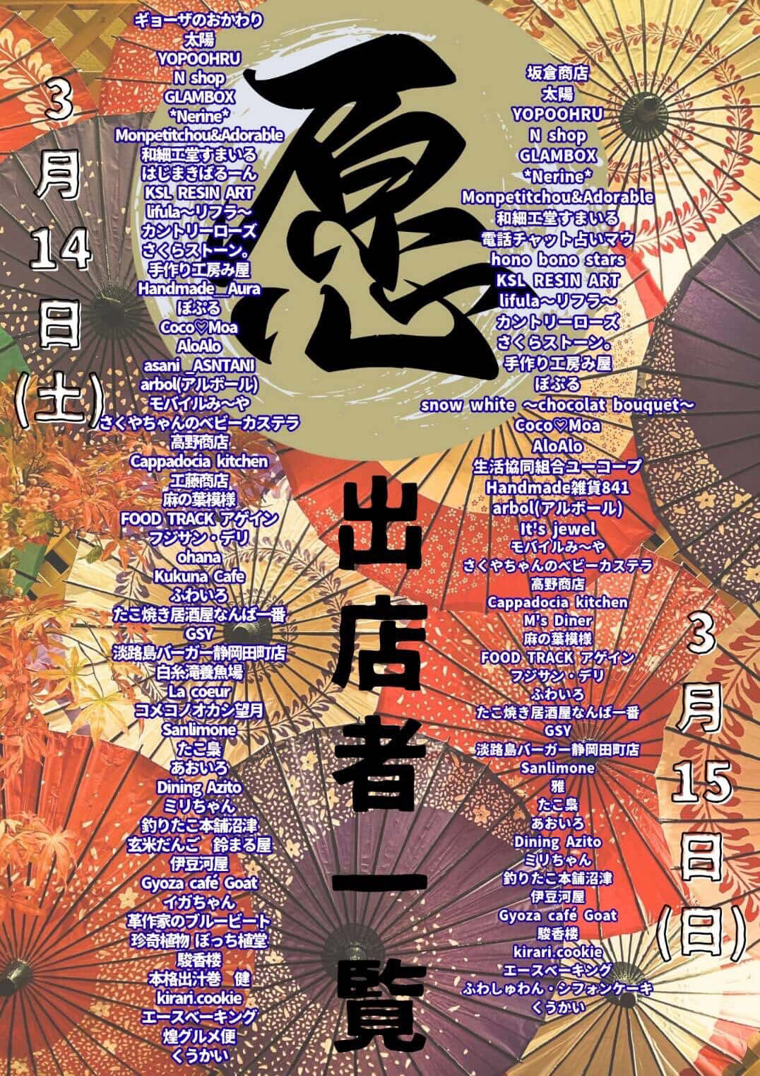 ギョーザのおかわり/太陽/YOPOOHRU/N shop/GLAMBOX/*Nerine*/Monpetitchou&Adorable/和細工堂すまいる/はじまきばるーん /KSL RESIN ART /ifurla~ リブラ~/カントリーローズ/さくらストーン。/手作り工房み屋/Handmade _Aura/ぽぷる/Coco♡Moa/AloAlo/asani_ASNTANI/arbol (アルボール)/モバイルみ〜や/さくやちゃんのベビーカステラ/高野商店/ Cappadocia kitchen/工藤商店/麻の葉模様/FOOD TRACK アゲイン/フジサン・デリ/ohana/Kukuna Cafe/ふわいろ/たこ焼き居酒屋なんば一番/GSY/淡路島バーガー静岡田町店/白系滝養魚場/La coeur/コメコノオカシ望月/Sanlimone/たこ梟/あおいろ/Dining Azito/ミリちゃん/釣りたこ本舗沼津/玄米だんご 鈴まる屋/伊豆河屋/Gyoza café Goat/イガちゃん/革作家のブルービート/珍奇植物ぼっち植堂/駿香楼/本格出汁巻 健/kirari.cookie/エースベーキング/煌グルメ便/くうかい