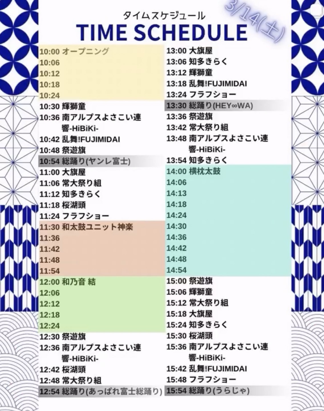 「15日」名從弐我/桜花乱咲/薫風/祭遊旗/知多きらく/育成会/北斗祭友会/大旗屋/ぬまづ熱風舞人/甲斐の国 小砕/樂笑/乱舞!FUJIMIDAI/龍神華/桜湖頭/輝獅童/孝雄&海人
