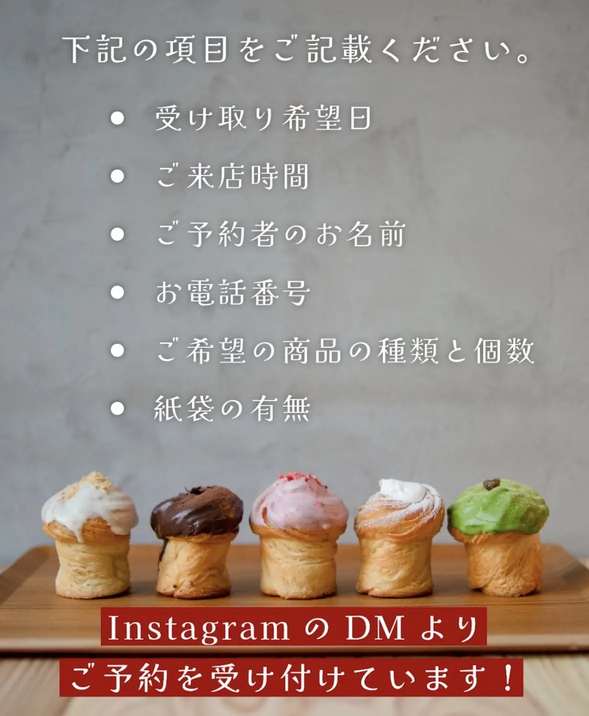 「予約方法」店頭、公式InstagramのDMにて