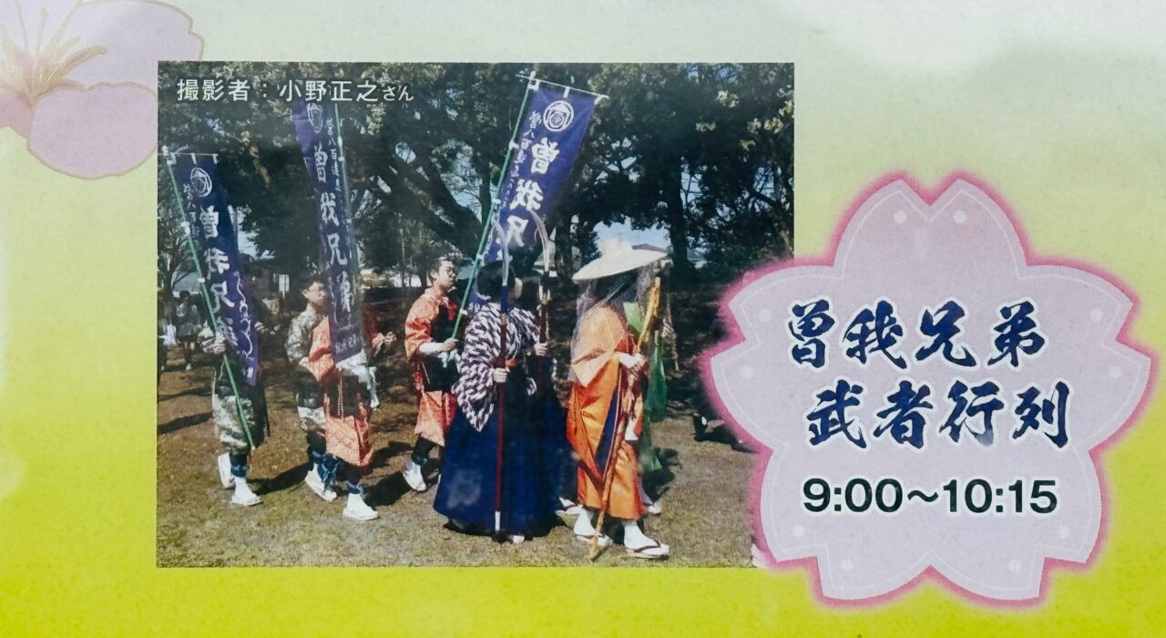 鷹岡小学校の児童及び鷹岡中学校の生徒が武者の衣装を着て曽我兄弟武者行列を行います。9:00に鷹岡まちづくりセンターを出発して9:25から、ステージにてお披露目予定です。