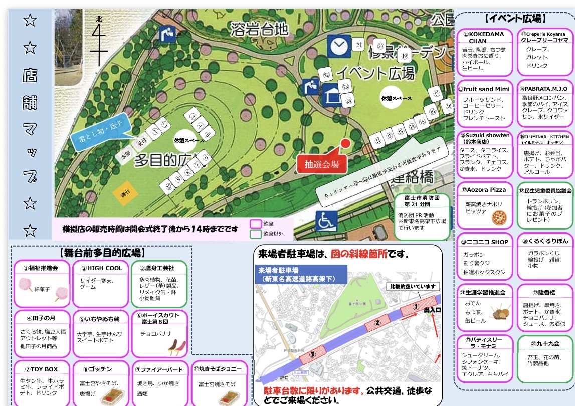 駐車台数に限りがありますので、公共交通機関、徒歩などでご来場ください。