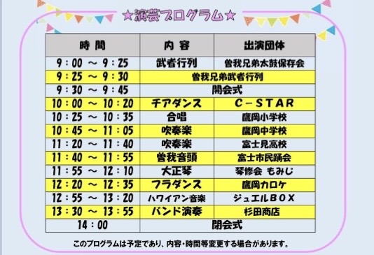 武者行列のお披露目が終了後に開会式が行われます。開会式後の演芸プログラムは、チアダンス、合唱、吹奏楽、フラダンス、大正琴、銭太鼓・傘おどり、歌謡曲、バンドの演奏などあります。