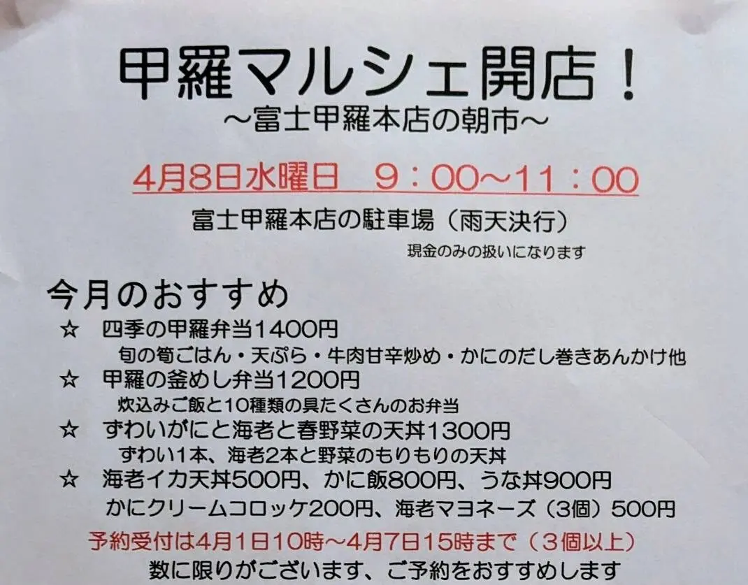 2026年4月8日(水)「富士甲羅本店八宏園」の駐車場にて甲羅の朝市「甲羅マルシェ」が開催されます。