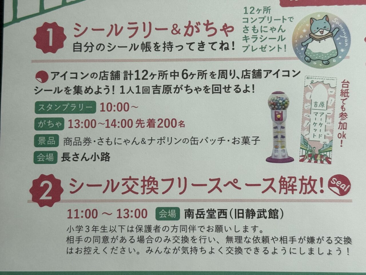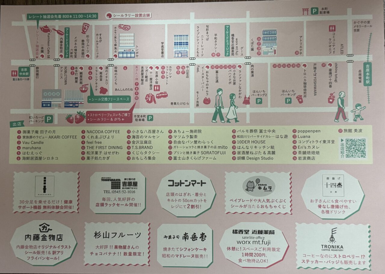 シールラリー対象店舗は12ヶ所あります。6ヶ所のスタンプを集めると1人1回「吉原がちゃ」を回せます。がちゃの会場は長さん小路です。13:00~14:00