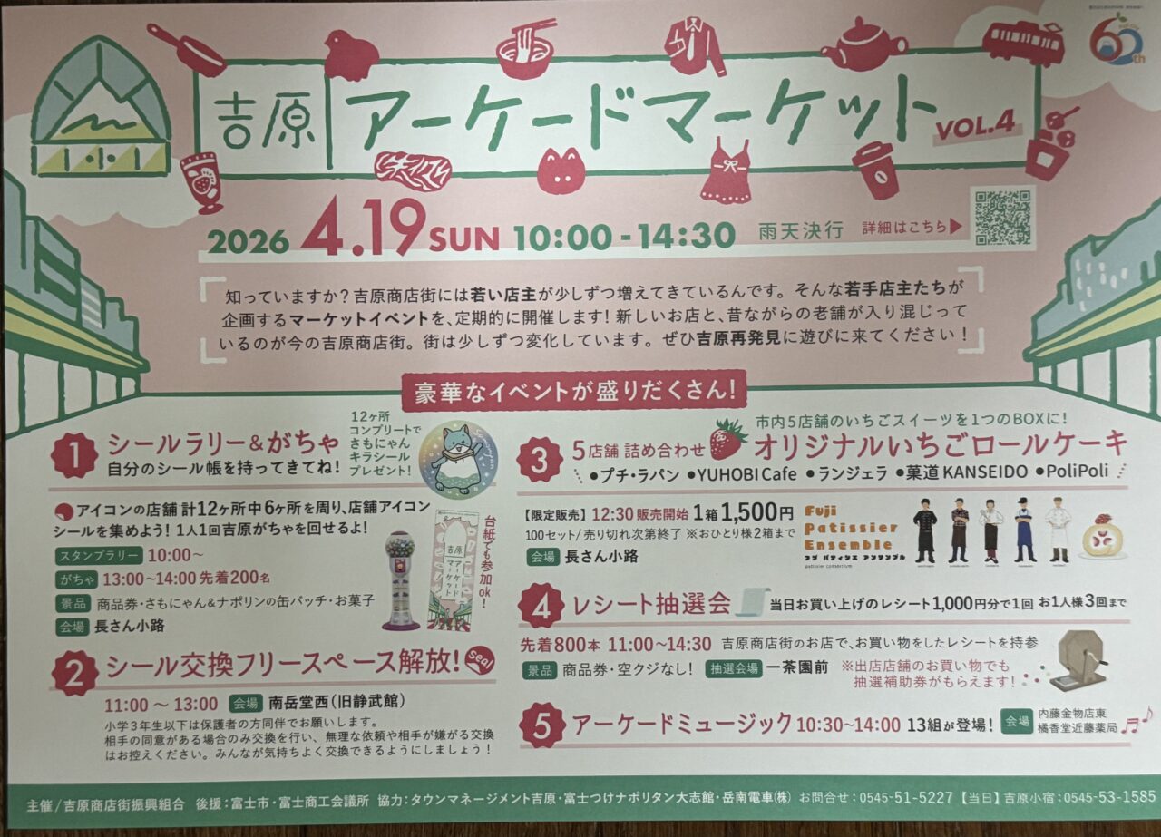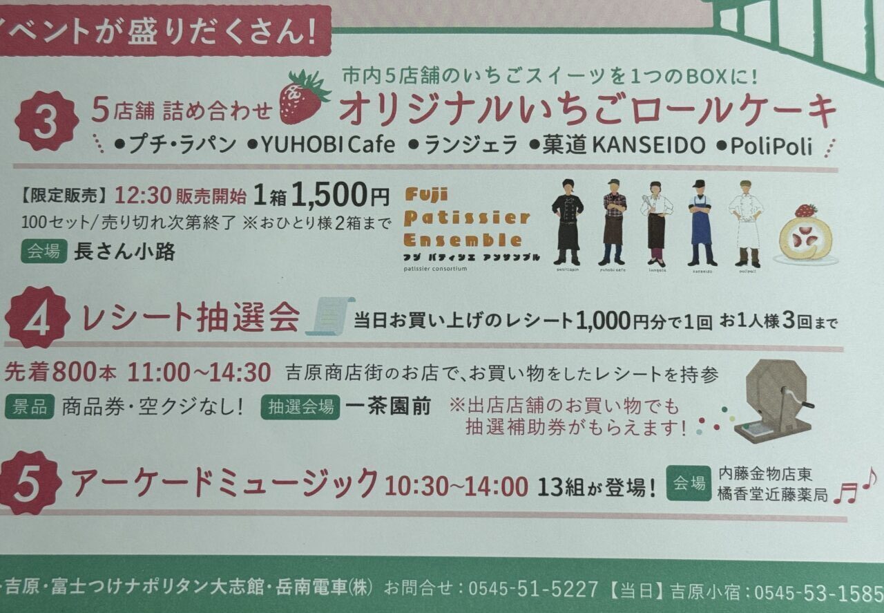 【富士市】4月19日「吉原アーケードマーケットVOL.4」開催!今回のスイーツは、「オリジナルいちごロールケーキ5店舗詰め合わせ」