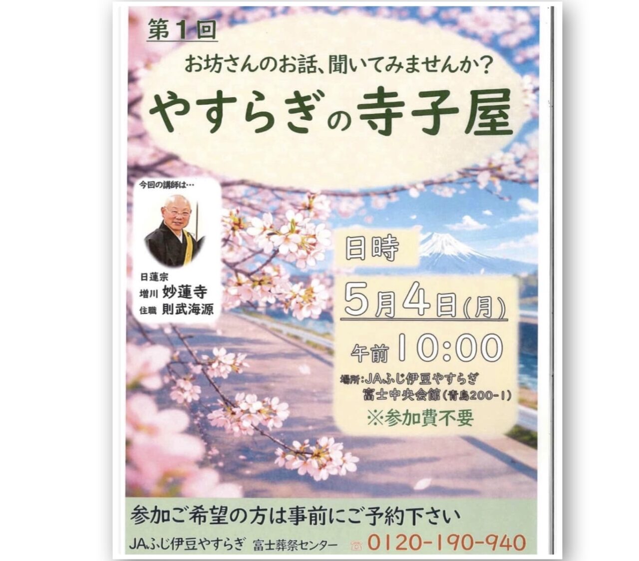 【富士市】お寺の住職さんの講話を聴いてみませんか?5月4日「やすらぎの寺小屋」参加者募集中!
