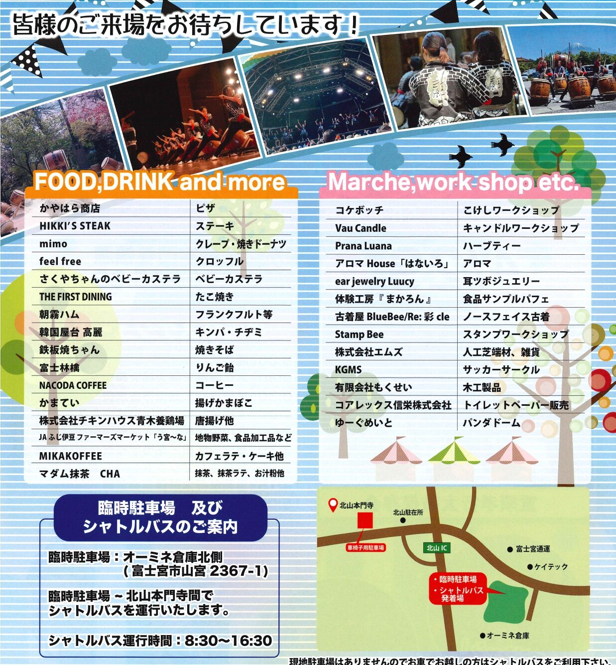 「かやはら商店」ピザ「HIKKI’S STEAK」ステーキ「mimo」クレープ・焼きドーナツ「feel free」クロッフル「さくやちゃんのベビーカステラ」ベビーカステラ「THE FIRST DINING」たこ焼き「朝霧ハム」フランクフルト等「韓国屋台 高麗」キンパチヂミ「鉄板焼ちゃん」焼きそば「富士林檎」りんご飴「NACODA COFFEE」コーヒー「有限会社もくせい」木工製品「かまてい」揚げかまぼこ「株式会社チキンハウス青木養鶏場」唐揚げ他「JAふじ伊豆ファーマーズマーケットう宮〜な」地物野菜、 食品加工品など「MIKAKOFFEE」カフェラテ・ケーキ他「マダム抹茶 CHA」 抹茶、抹茶ラテ、お汁粉他