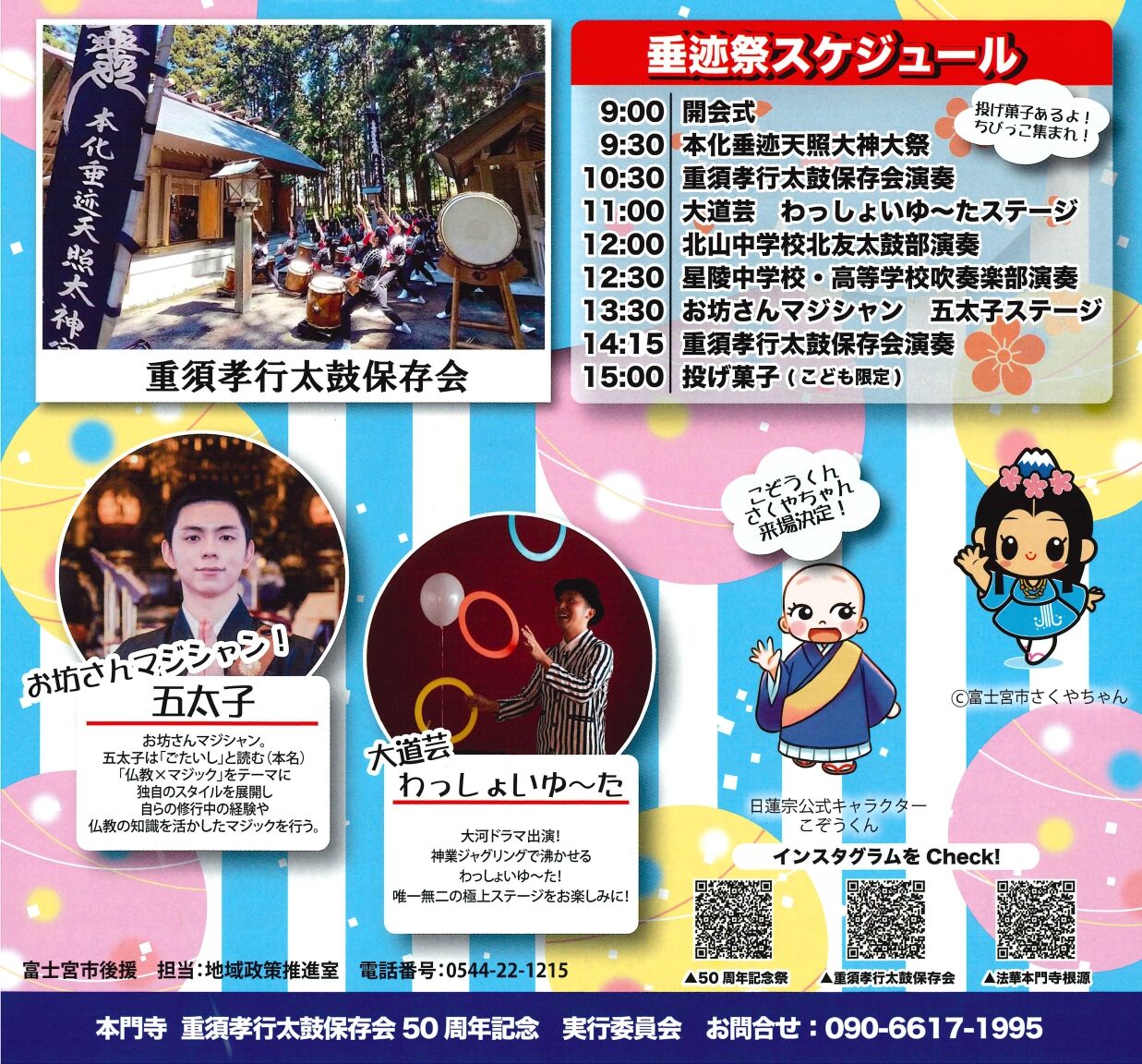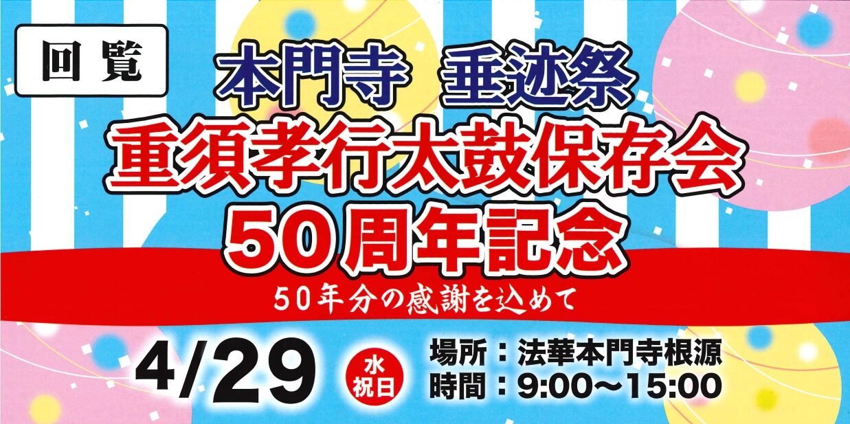 2026年4月29日(水・祝)北山に鎮座する「法華本門寺根源」にて「本門寺垂迹祭 重須孝行太鼓保存会50周年記念」のイベントが開催されます。太鼓の演奏、大道芸、マジックなどのステージやマルシェが行われます。