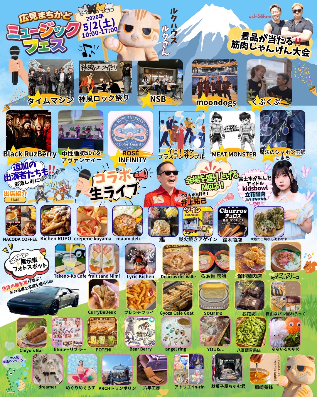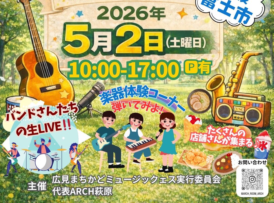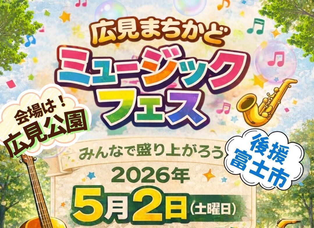 2026年5月2日(土)10:00~17:00「広見まちかどミュージックフェス」が広見公園(富士市伝法 46-1)にて開催されます。